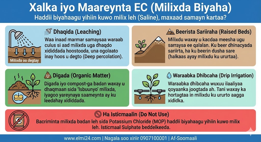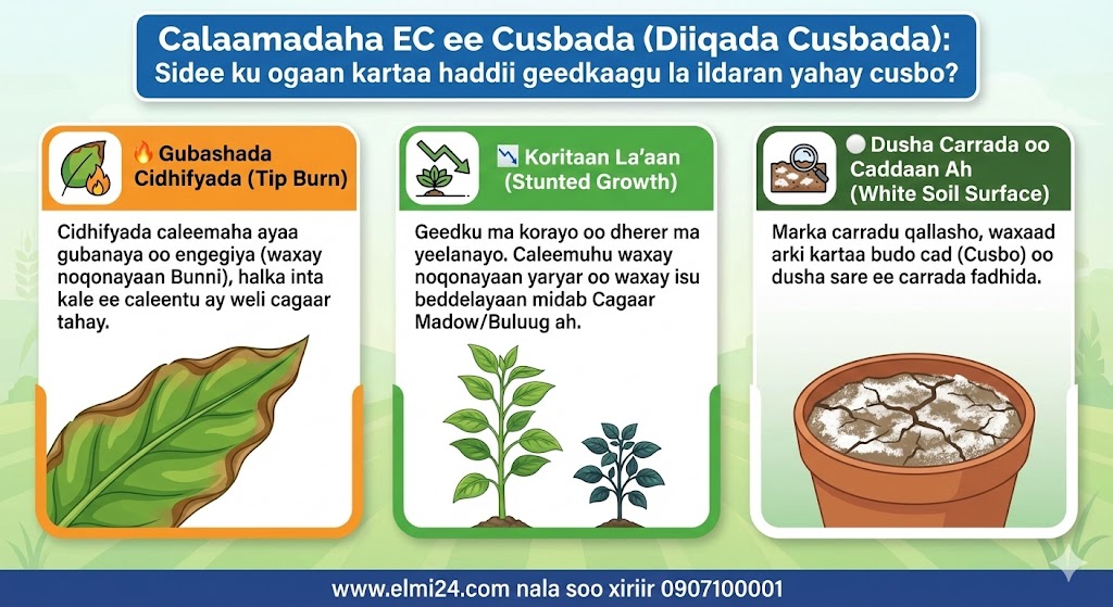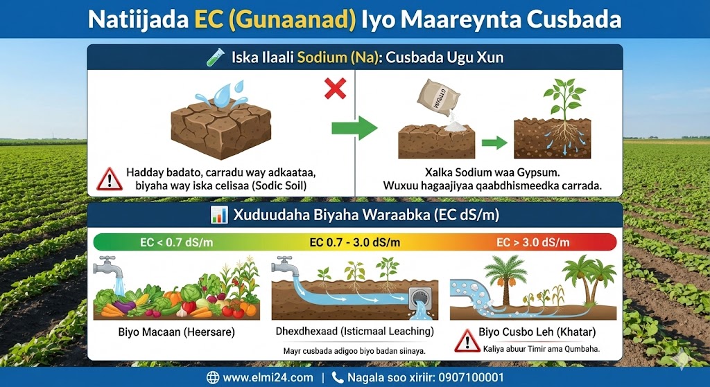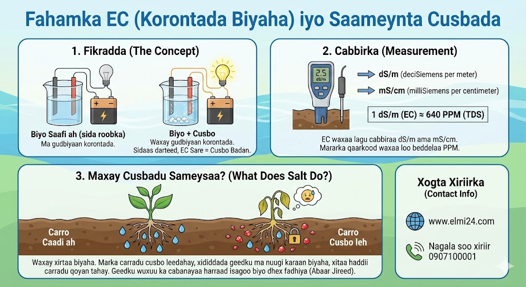 Soomaaliya dhibaatada ugu weyn ee beeraha haysata waa biyo dhanaan (Salty Water). Cilmiga EC (Electrical Conductivity) ayaa lagu cabiraa inta cusbo ee ku jirta biyahaaga ama carradaada.