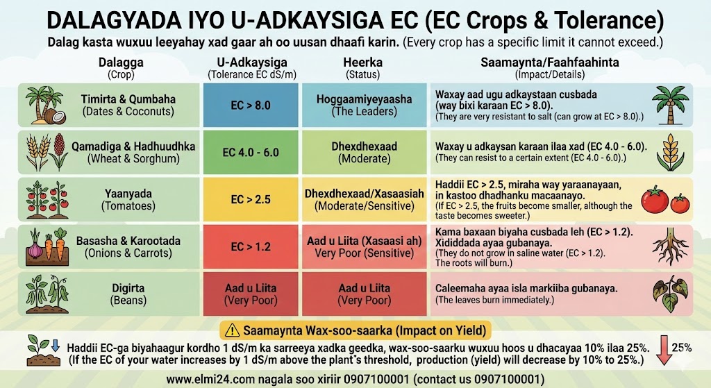 | Basasha & Karootada | Aad u Liita (Sensitive) | Kuma baxaan biyo dhanaan (EC > 1.2). Xididka ayaa gubanaya. |
