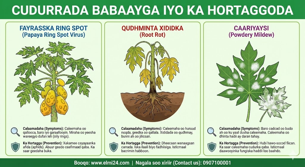 Daawo: Malaha Daawo. Waa inaad geedka rujisaa oo gubtaa. Waxaa lagu xakameeyaa in la dilo Aphids (Xayaayada) oo cudurka gudbisa.