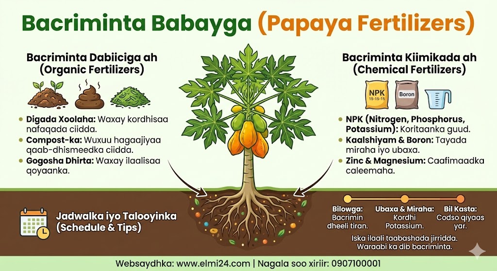 | Bisha 1aad - 3aad | CAN ama Urea (Nitrogen) | Korriinka Jirridda iyo Caleenta (Vegetative Growth). |