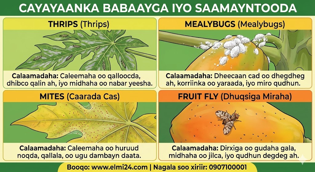 | Joogto | Boron + Zinc (Foliar) | Si miruhu aysan u noqon qalooc (Deformed fruits). |