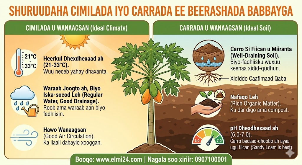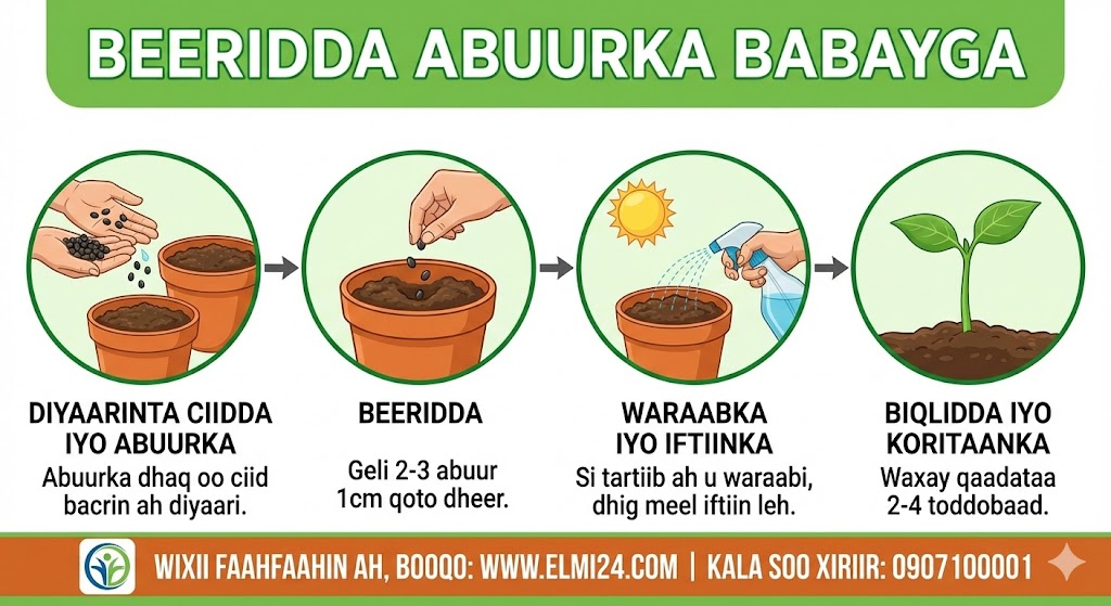 Dulmar: Buuggan waxaad ku baran doontaa hababka casriga ah ee loo beero Babaayga, laga bilaabo diyaarinta dhulka, xulashada abuurka, dhibic-dhibicda (Drip), ka hortagga cudurada iyo suuq-geynta.