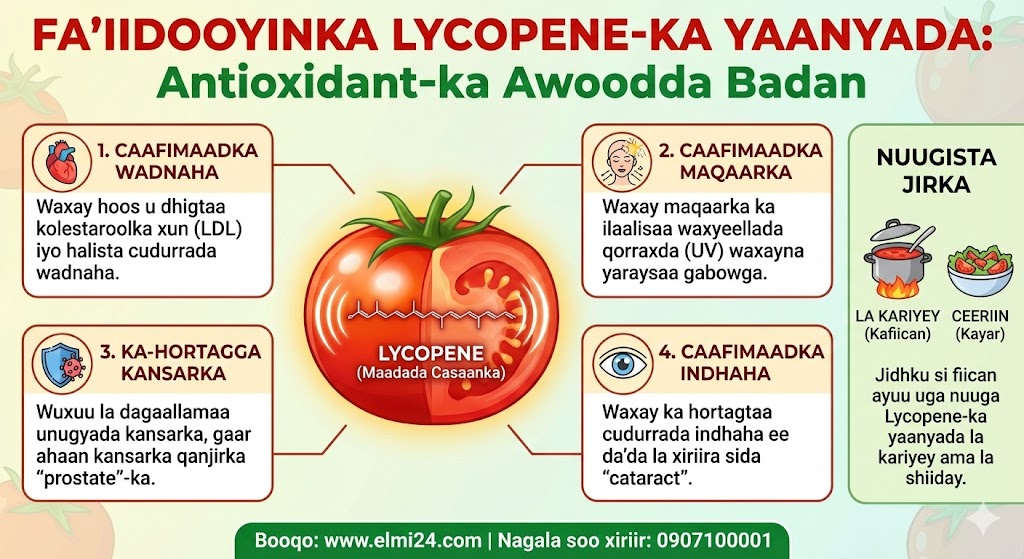 Waxay qani ku tahay Lycopene (Antioxidant), Vitamin C, Potassium, iyo Vitamin K. Waxay u fiican tahay wadnaha iyo maqaarka.