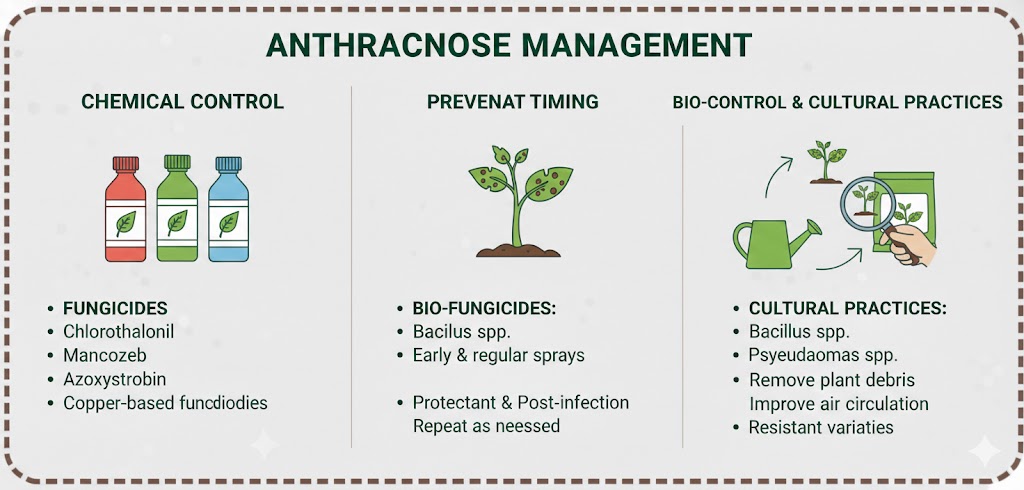 Anthracnose waa cudurka "boobka goosashada". Wuxuu kaa baabi'in karaa faa'iidadii aad ka sugaysay miraha markay suuqa u dhow yihiin. Sirta guusha waa inaad beerta ka dhigto mid hawo fiican leh (open canopy) iyo inaad isticmaasho fungicides-ka ka hortagga ah ka hor intaysan roobabku bilaaban.