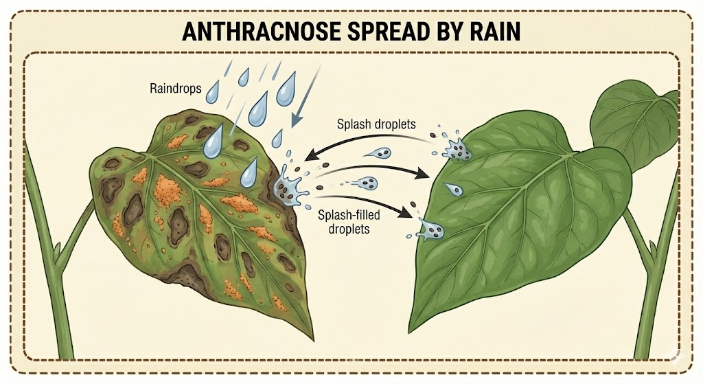 Anthracnose waa cudur jecel biyaha. Si ka duwan Rust ama Powdery Mildew, kani wuxuu si xooggan ugu faafaa **dhibcaha roobka**.
