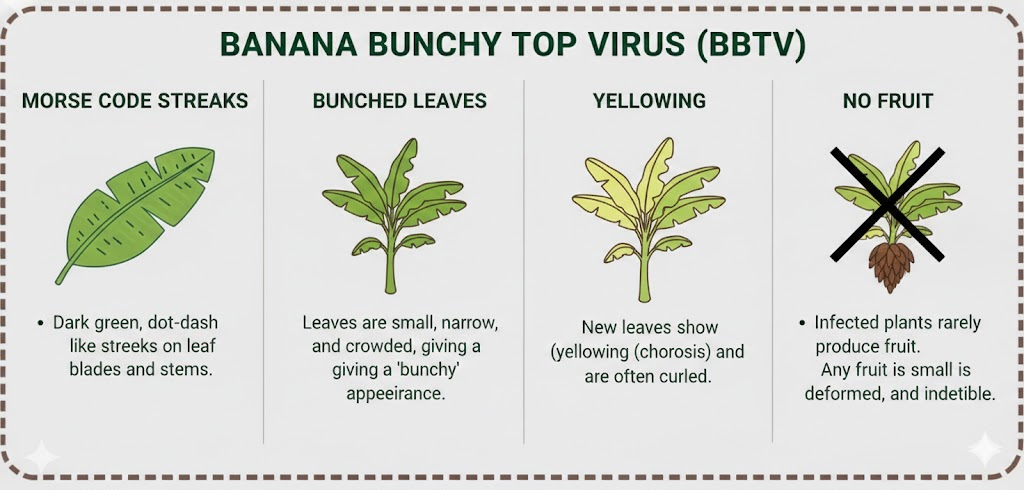 - **No Fruit:** Geedka uu haleelo BBTV badanaa ma soo saaro miro, haddii uu soo saarona waxay noqdaan kuwo yaryar oo qalloocan.