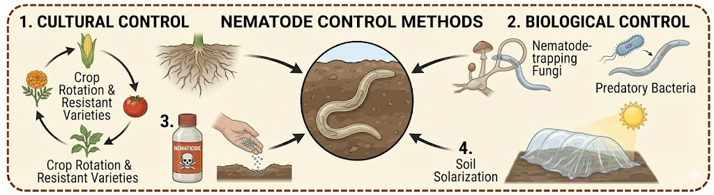 - **Organic Matter:** Ku dar carada digada xoolaha iyo compost, waxay dhiirigelisaa fangasyada dabiiciga ah ee nematodes-ka cuna.
