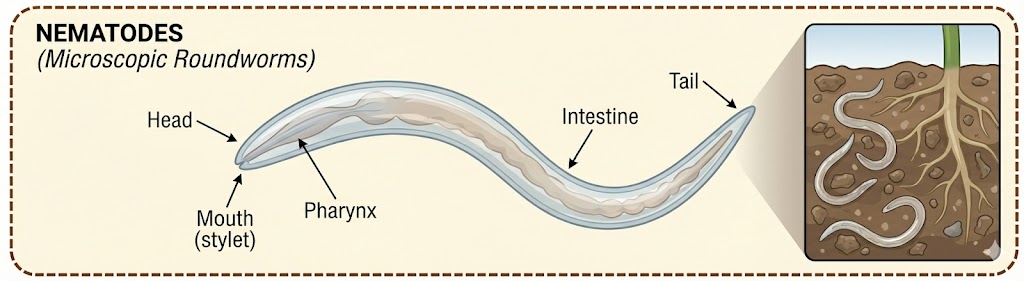 Nematodes waa gooryaan aad u yaryar (microscopic) oo ku nool ciida. Inkastoo qaarkood waxtar leeyihiin,laakiin kuwa dhibka keena (Plant-parasitic nematodes) waxay mudaan xididdada geedka, iyagoo Nuuga nafaqada iyo biyaha.