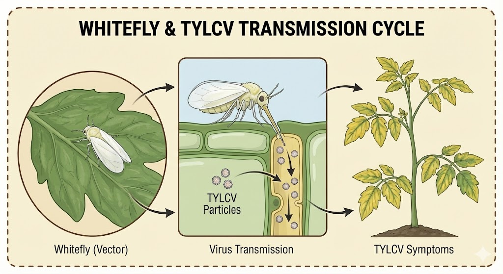 Fayraska TYLCV wuxuu joojiyaa koritaanka geedka, wuxuuna ka dhigaa caleemaha kuwo isku duubma oo huruud ah. Hal whitefly oo kaliya ayaa qaadi kara fayraska oo u gudbin kara beerta oo dhan.