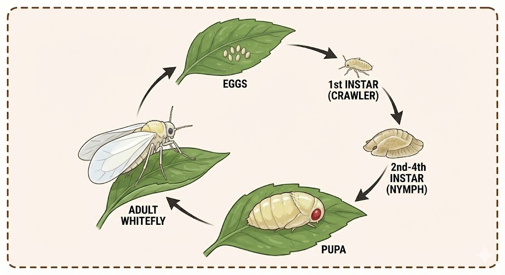 Meertada nolosha Whitefly waa mid aad u degdeg badan, taas oo keenta inay beerta ku fidaan maalmo gudahood.