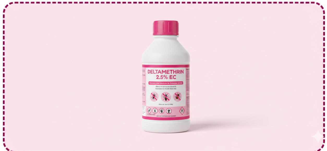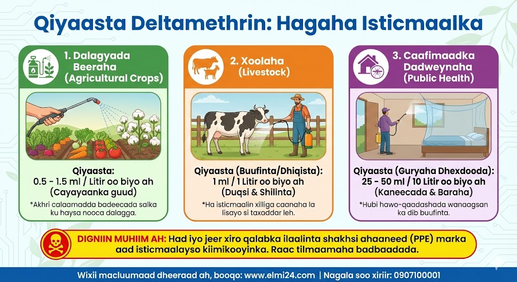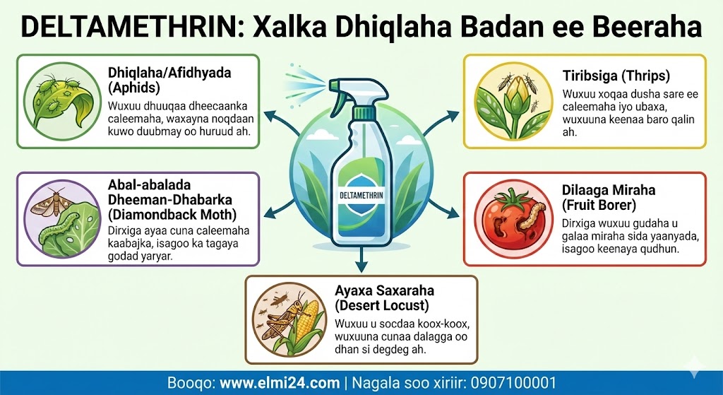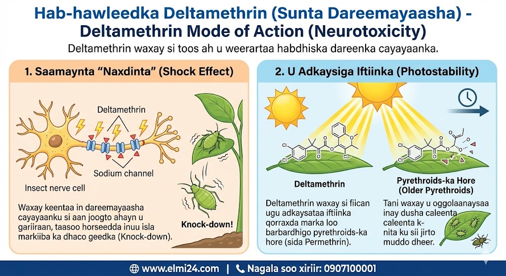 Deltamethrin waa sun ka tirsan kooxda Synthetic Pyrethroids. Waxay kaga duwan tahay kuwa kale inay tahay midda ugu saameynta badan marka loo eego miisaanka yar. Waxay dishaa cayayaanka marka ay taabato (Contact) iyo marka ay caloosha u gasho (Stomach action).