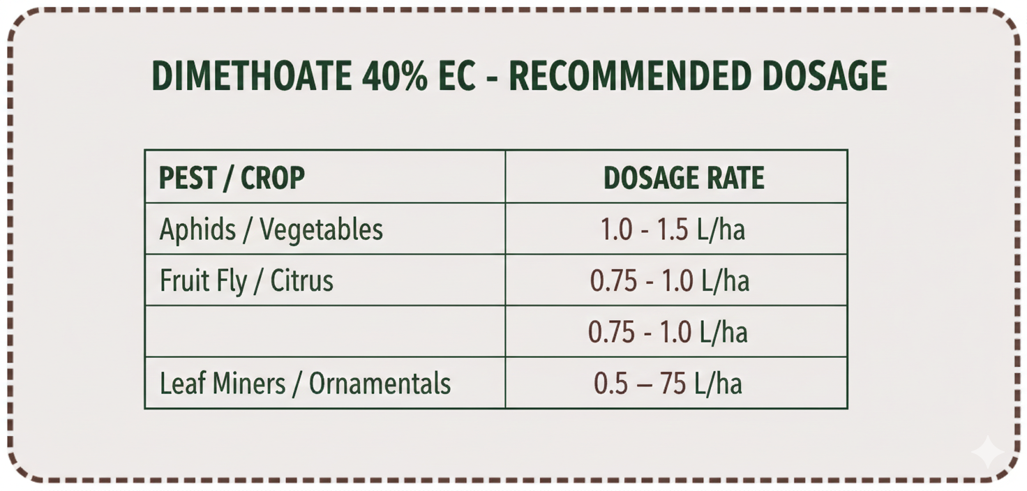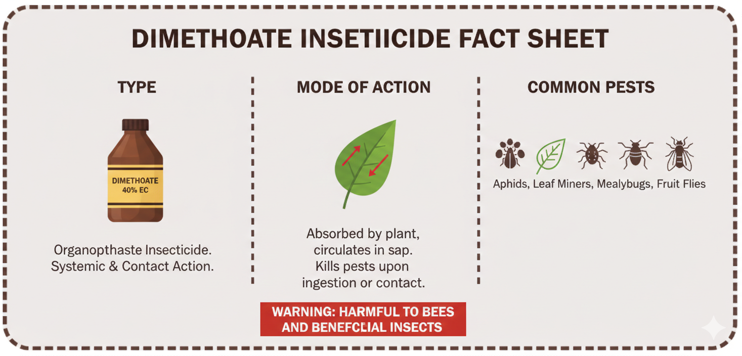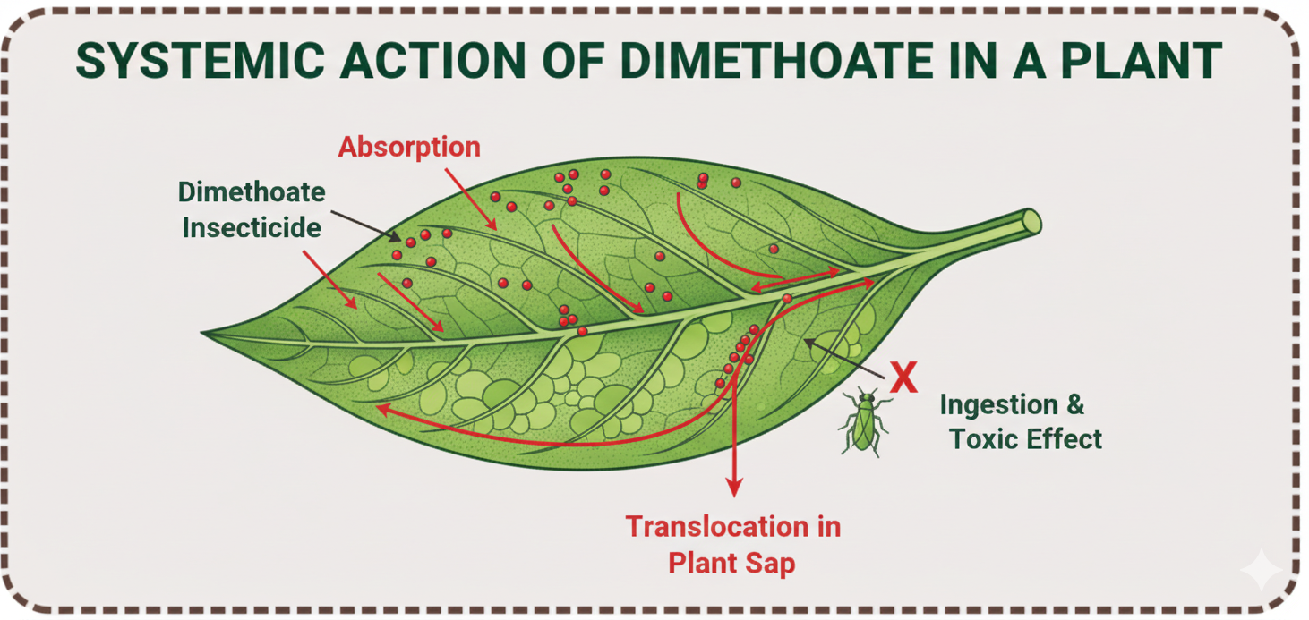 Dimethoate waa sun xooggan oo leh sifo **Systemic** iyo **Contact** ah. Waxay u dhex gashaa dheecaanka geedka, taasoo ka dhigta mid disha cayayaanka dhuuqa iyo kuwa ku dhex dhuunta caleenta ama miraha dhexdooda.